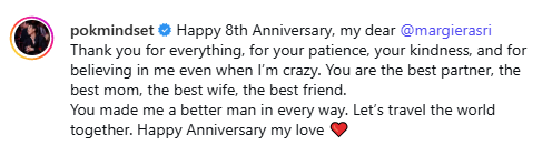 ขณะที่ "ป๊อก ภัสสรกรณ์" ก็ได้โพสต์ข้อความเช่นกันว่า "ครบรอบ 8 ปีแล้ว ที่รัก ขอบคุณสำหรับทุกสิ่ง สำหรับความอดทน ความใจดีของคุณ และเชื่อในตัวฉัน แม้ในตอนที่ฉันงี่เง่าก็ตาม คุณคือคู่หูที่ดีที่สุด แม่ที่ดีที่สุด ภรรยาที่ดีที่สุด เพื่อนที่ดีที่สุด คุณทำให้ฉันเป็นผู้ชายที่ดีขึ้น ไปเที่ยวทั่วโลกด้วยกันต่อนะ สุขสันต์วันครบรอบนะที่รัก"