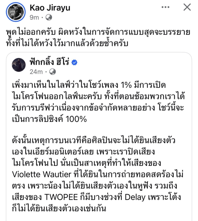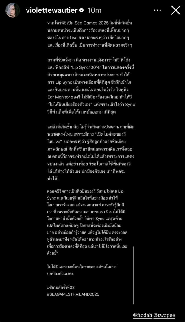 นอกจากนี้ "วิโอเลต วอเทียร์" ยังได้โพสต์ข้อความว่า "จากโชว์พิธีเปิด Sea Games 2025 วันนี้ที่เกิดขึ้น หลายคนน่าจะเห็นถึงการร้องเพลงที่เพี๊ยนมากๆ ของวีในทาง Live สด บอกตรงๆว่า เสียใจมากๆ และเรื่องที่เกิดขึ้น เป็นการทำงานที่ผิดพลาดจริงๆตามที่รับแจ้งมา คือ ทางงานแจ้งมาว่าให้วี พี่โต้ง และ พี่กอล์ฟ “Lip Sync100%” ในการแสดงครั้งนี้ ด้วยเหตุผลทางด้านเทคนิคหลายประการ ทำให้การ Lip Sync เป็นทางเลือกที่ดีที่สุด ซึ่งวีก็เข้าใจและยินยอมตามนั้น และในตอนโชว์จริง ในหูฟัง Ear Monitor ของวี ไม่มีเสียงร้องสดวีเลย ทำให้วี “ไม่ได้ยินเสียงร้องตัวเอง” แต่เพราะเข้าใจว่า Sync วีก็ทำเต็มที่เพื่อให้ภาพมันออกมาดีที่สุด"