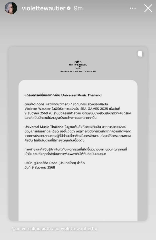 ต่อมา ทางค่าย Universal Music Thailand ก็ได้ออกมาร่อนแถลงการณ์เช่นกัน ระบุข้อความว่า "แถลงการณ์ชี้แจงจากค่าย Universal Music Thailand ตามที่ได้เกิดกระแสวิพากษ์วิจารณ์เกี่ยวกับการแสดงของศิลปิน Violette Wautier ในพิธีเปิดการแข่งขัน SEA GAMES 2025 เมื่อวันที่ 9 ธันวาคม 2568 ณ ราชมังคลากีฬาสถาน ซึ่งมีผู้ชมบางส่วนสังเกตว่าเสียงร้องของศิลปินมีความไม่สมบูรณ์ระหว่างการออกอากาศนั้น"