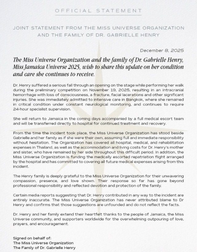 "รายงานจากสื่อบางสำนักที่กล่าวว่า ดร.เฮนรี มีส่วนทำให้เกิดอุบัติเหตุขึ้นนั้นไม่เป็นความจริง องค์กรมิสยูนิเวิร์สไม่เคยโทษ ดร.เฮนรี และยืนยันว่าข้อกล่าวหาเหล่านั้นไม่มีมูลและไม่ตรงกับข้อเท็จจริง ดร.เฮนรีและครอบครัวขอขอบคุณชาวจาเมกา ชุมชนมิสยูนิเวิร์ส และผู้สนับสนุนทั่วโลกจากใจ สำหรับความรัก คำอธิษฐาน และกำลังใจที่ส่งมาอย่างล้นหลาม"