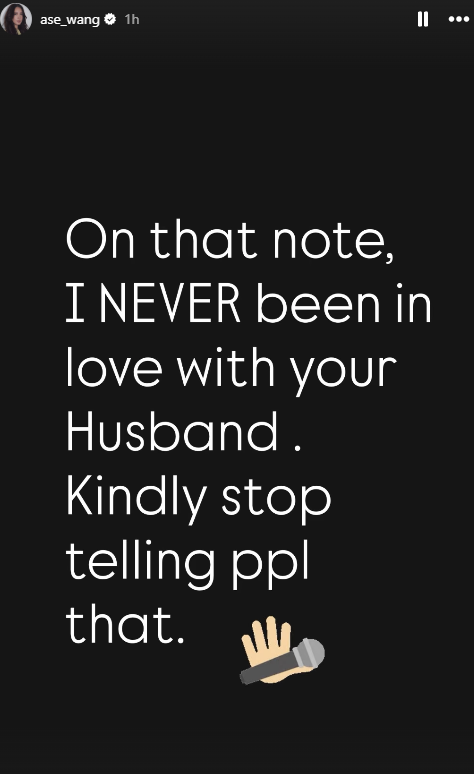 - "ขอพูดให้ชัดเจนว่า ฉันไม่เคยรักกับสามีของคุณ กรุณาหยุดบอกคนอื่นแบบนั้นด้วย"