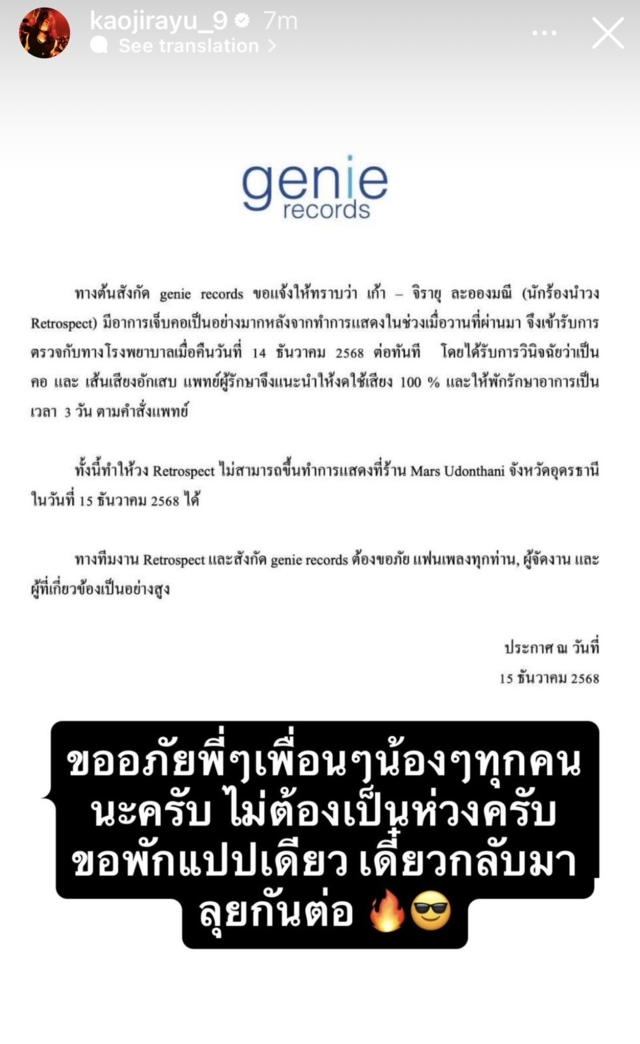 "โดยได้รับการวินิจฉัยว่าเป็นคอ และ เส้นเสียงอักเสบ แพทย์ผู้รักษาจึงแนะนำให้งดใช้เสียง 100 % และให้พักรักษาอาการเป็นเวลา 3 วัน ตามคำสั่งแพทย์ ทั้งนี้ทำให้วง Retrospect ไม่สามารถขึ้นทำการแสดงที่ร้าน Mars Udonthani จังหวัดอุดรธานี ในวันที่ 15 ธันวาคม 2568 ได้ ทางทีมงาน Retrospect และสังกัด genie records ต้องขอภัย แฟนเพลงทุกท่าน ผู้จัดงาน และผู้ที่เกี่ยวข้องเป็นอย่างสูง ประกาศ ณ วันที่ 15 ธันวาคม 2568"