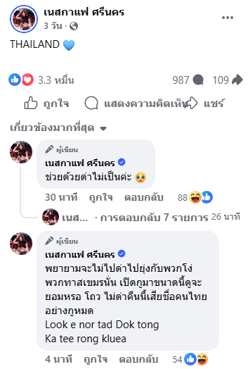 ก่อนที่ในเวลาต่อมา จะเข้ามาคอมเมนต์ใต้โพสต์ที่ถูกทัวร์ลงว่า "ช่วยด้วยด่าไม่เป็นค่ะ" พร้อมด้วยคอมเมนต์ว่า "พยายามจะไม่ไปด่าไปยุ่งกับพวกโง่พวกทาสเขมรนั่น เปิดกูมาขนาดนี้ดูจะยอมหรอ โถว ไม่ด่าคืนนี้เสียชื่อคนไทยอย่างกูหมด Look e nor tad Dok tong Ka tee rong kluea" จากนั้น เพจดัง แฟนคลับ รวมถึงชาวโซเชียลฝั่งไทยก็รีบไปเคลื่อนไหวสยบรถทัวร์