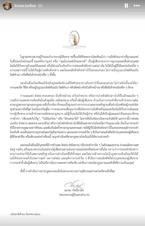 ล่าสุด "โนว์เบลล์" ได้ออกมาเคลื่อนไหวครั้งแรก หลังจากเกิดประเด็นร้อนด้วยข้อความจาก "ณภษร วริทธิ์ภานิช" ทนายความผู้รับมอบอำนาจ เพื่อออกโรงเตือน และเอาผิดทางกฏหมาย โดยระบุข้อความว่า