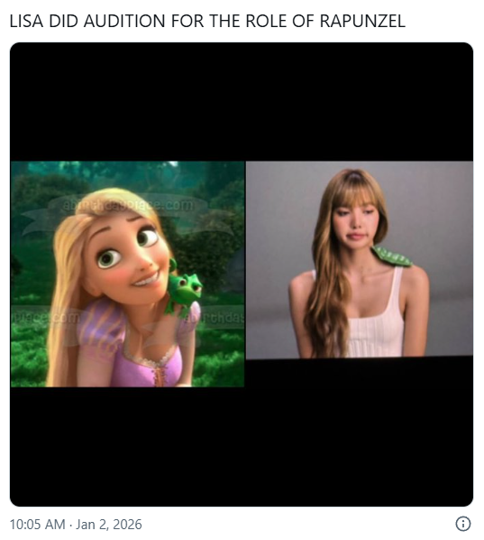 ตอกย้ำกระแสข่าวลือยิ่งขึ้นไปอีก ล่าสุด วันที่ 2 มกราคม "ลิซ่า" ได้เผยภาพรีแคปช่วงปี 2025 ที่ผ่านมา ทั้งภาพเบื้องหลังการถ่ายทำ MV แต่ภาพที่ทำเอาสะดุดตาคงไม่พ้น ภาพนิ่งของลิซ่าที่มีแผ่นสีเขียวแปะอยู่บนไหล่ ขึ้นคู่กับภาพของ "ราพันเซล" ทำให้เกิดการคาดเดาว่า เธอกำลังทำการทดสอบหน้ากล้อง (Screen Test) สำหรับบทบาทนี้หรือเปล่า