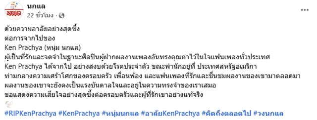 ขณะที่เฟซบุ๊กเพจของ "นกแล" เผยถึงสาเหตุการเสียชีวิตว่า "ด้วยความอาลัยอย่างสุดซึ้งต่อการจากไปของ Ken Prachya (หนุ่ม นกแล) ผู้เป็นที่รักและจดจำในฐานะศิลปินผู้ฝากผลงานเพลงอันทรงคุณค่าไว้ในใจแฟนเพลงทั่วประเทศ Ken Prachya ได้จากไป อย่างสงบด้วยโรคประจำตัว ขณะพำนักอยู่ที่ ประเทศสหรัฐอเมริกา ท่ามกลางความเศร้าโศกของครอบครัว เพื่อนพ้อง และแฟนเพลงที่รักและชื่นชมผลงานของเขามาตลอดมา ผลงานของเขาจะยังคงเป็นแรงบันดาลใจและอยู่ในความทรงจำของเราเสมอ ขอแสดงความเสียใจอย่างสุดซึ้งต่อครอบครัวและผู้ที่รักเขาอย่างแท้จริง"