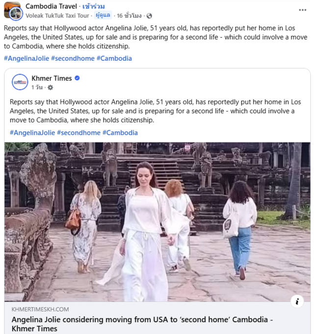 Khmer Times รวมถึงสื่อกัมพูชาอื่นๆ พยายามรายงานข่าวกล่าวอ้างว่า "แองเจลินา โจลี (Angelina Jolie)" นางเอกแห่งวงการฮอลลีวูดวัย 51 ปี กำลังวางแผนที่จะย้ายออกจากสหรัฐอเมริกา และประกาศขายคฤหาสน์หรูของเธอในลอสแอนเจลิส เพื่อไปเริ่มต้นชีวิตใหม่ในต่างแดน โดยมี "กัมพูชา" เป็นหนึ่งในจุดหมายปลายทางหลัก