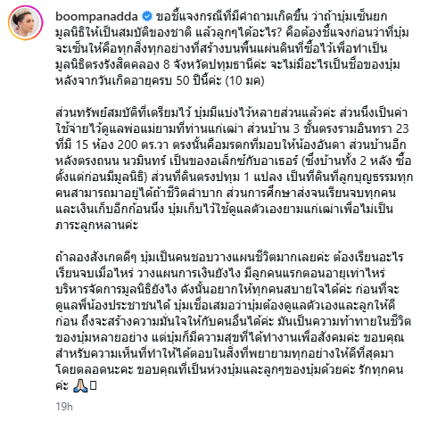 ล่าสุด "บุ๋ม ปนัดดา" ได้ออกมาโพสต์ผ่านโลกโซเชียลระบุว่า "ขอชี้แจงกรณีที่มีคำถามเกิดขึ้น ว่าถ้าบุ๋มเซ็นยกมูลนิธิให้เป็นสมบัติของชาติ แล้วลูกๆได้อะไร? คือต้องชี้แจงก่อนว่าที่บุ๋มจะเซ็นให้คือทุกสิ่งทุกอย่างที่สร้างบนพื้นแผ่นดินที่ซื้อไว้ เพื่อทำเป็นมูลนิธิตรงรังสิตคลอง 8 จังหวัดปทุมธานีค่ะ จะไม่มีอะไรเป็นชื่อของบุ๋ม หลังจากวันเกิดอายุครบ 50 ปีนี้ค่ะ (10 มค)