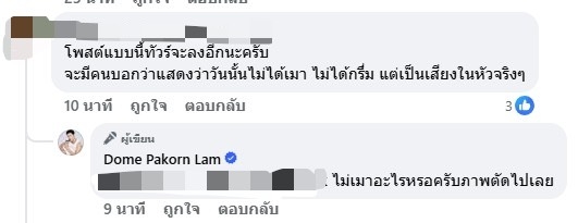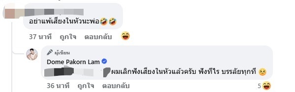 ขณะที่แฟนคลับก็เข้ามาแซวกันสนั่น อาทิ "โอเคค่ะๆ แต่เจ้าของเพจรับจบนะคะ" ซึ่งเจ้าตัวก็ได้เข้าตอบว่า "หนักแค่ไหน ฉันรับไว้เองงงง" ทั้งยังมีคอมเมนต์จากแฟนคลับอีกว่า "จะมีคนบอกว่าแสดงว่าวันนั้นไม่ได้เมา ไม่ได้กรึ่ม แต่เป็นเสียงในหัวจริงๆ" โดยพี่โดมก็ตอบกลับว่า "ไม่เมาอะไรหรอครับภาพตัดไปเลย" รวมถึงคอมเมนต์ที่ว่า "อย่าแพ้เสียงในหัวนะพ่อ" ซึ่งเจ้าตัวก็ตอบว่า "ผมเลิกฟังเสียงในหัวแล้วครับ ฟังทีไร บรรลัยทุกที"