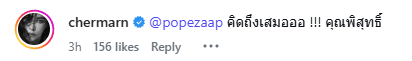 จนชาวโซเชียลเข้ามาคอมเมนต์สนั่น อาทิ "เป้ย ปานวาด, ลิเดีย ศรัณย์รัชต์, หยาดทิพย์, เอมมี่ มรกต, วิกกี้ สุนิสา, เดียร์น่า ฟลีโป" หรือแม้แต่ "โป๊ป ธนวรรธน์" ได้เข้ามาคอมเมนต์ว่า "คิดถึงนะ" จนหลายคนหวนนึกถึงตัวละคร คุณพิสุทธิ์ กับ กะรัต ในเรื่อง สามีตรา