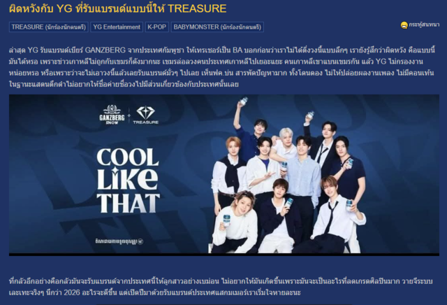กลายเป็นประเด็นร้อนแรงไปทั่วทั้งโซเชียล เมื่อแบรนด์ GANZBERG เครื่องดื่มแอลกอฮอลล์ (เบียร์) จากกัมพูชา ได้ประกาศเปิดตัว "TREASURE" วงบอยแบนด์จากค่าย YG Entertainment ในฐานะ Brand Ambassador อย่างเป็นทางการ แต่หลังจากที่ประกาศออกไปนั้นได้เกิดกระแสวิพากษ์วิจารณ์อย่างหนักจากกลุ่มแฟนคลับทั่วโลก โดยเฉพาะในประเทศไทย