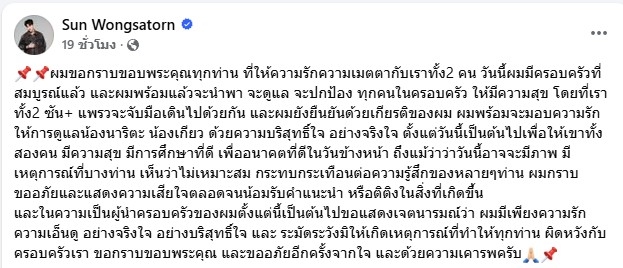 ตั้งแต่วันนี้เป็นต้นไปเพื่อให้เขาทั้งสองคน มีความสุข มีการศึกษาที่ดี เพื่ออนาคตที่ดีในวันข้างหน้า ถึงแม้ว่าว่าวันนี้อาจจะมีภาพ มีเหตุการณ์ที่บางท่าน เห็นว่าไม่เหมาะสม กระทบกระเทือนต่อความรู้สึกของหลายๆท่าน ผมกราบขออภัยและแสดงความเสียใจตลอดจนน้อมรับคำแนะนำ หรือติติงในสิ่งที่เกิดขึ้น