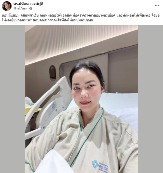 ขณะที่เฟซบุ๊กเพจ ยังได้โพสต์ข้อความเกี่ยวกับอาการเพิ่มเติมว่า "ตอนนี้แม่บุ๋ม ภูมิแพ้กำเริบ คุณหมอขอให้แอดมิดเพื่อตรวจร่างกายอย่างละเอียด และพักผ่อนให้เพียงพอ จึงขอให้งดเยี่ยมก่อนนะคะ ขอบคุณทุกกำลังใจที่ส่งให้แม่บุ๋มค่ะ"