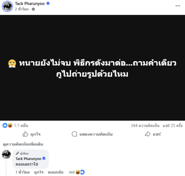ขณะที่ "แทค ภรัณยู" ดาราดังที่ไม่ว่าจะถ่ายรูปกับใคร คนนั้นก็ตกเป็นข่าวใหญ่สะเทือนโซเชียลอยู่เสมอ โดยล่าสุด เจ้าตัวออกมาโพสต์ว่า "ทนายยังไม่จบ พิธีกรดังมาต่อ...ถามคำเดียวกูไปถ่ายรูปด้วยไหม" พร้อมคอมเมนต์ตอบตัวเองว่า "ตอบเลยว่าใช่"