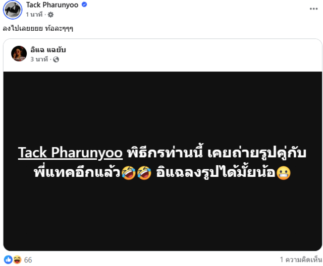 ทั้งยังแชร์ข้อความของเพจหนึ่งที่โพสต์ว่า "Tack Pharunyoo พิธีกรท่านนี้ เคยถ่ายรูปคู่กับพี่แทคอึกแล้ว🤣🤣 อิแฉลงรูปได้มั้ยน้อ😬" พร้อมระบุแคปชั่นว่า "ลงไปเลยยยย ท้อละๆๆๆ" แบบนี้ทางเพจจะลงรูปตามคำท้าจริงไหมนะ