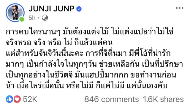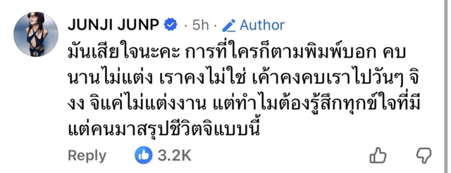 ทั้งยังคอมเมนต์เพิ่มเติมอีกว่า "มันเสียใจนะคะ การที่ใครก็ตามพิมพ์บอก คบนานไม่แต่ง เราคงไม่ใช่ เค้าคงคบเราไปวันๆ จิ งง จิแค่ไม่แต่งงาน แต่ทำไมต้องรู้สึกทุกข์ใจที่มีแต่คนมาสรุปชีวิตจิแบบนี้"