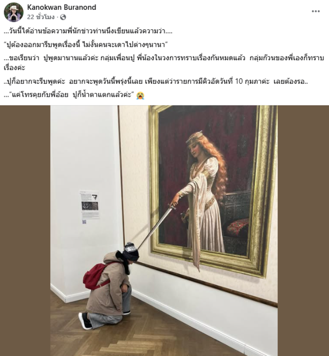 ล่าสุด "ปู กนกวรรณ" ออกมาโพสต์อีกครั้งเตรียมไปออกรายการดัง เผยว่า "วันนี้ได้อ่านข้อความพี่นักข่าวท่านนึงเขียนแล้วความว่า "ปูต้องออกมารีบพูดเรื่องนี้ ไม่งั้นคนจะเดาไปต่างๆนานา" ขอเรียนว่า ปูพูดมานานแล้วค่ะ กลุ่มเพื่อนปู พี่น้องในวงการทราบเรื่องกันหมดแล้ว กลุ่มก๊วนของพี่เองก็ทราบเรื่องค่ะ ปูก็อยากจะรีบพูดค่ะ อยากจะพูดวันนี้พรุ่งนี้เลย เพียงแต่ว่ารายการมีคิวอัดวันที่ 10 กุมภาค่ะ เลยต้องรอ แค่โทรคุยกับพี่อ้อย ปูก็น้ำตาแตกแล้วค่ะ"