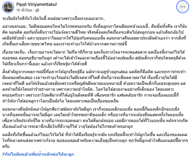แต่สิ่งที่เกิดขึ้นแล้วแก้ไขอะไรไม่ได้ ที่ทำได้คือเรียนรู้จากมัน บทเรียนนี้จะทำให้ลูกโตขึ้น และเรื่องของแผลใจที่หลายคนส่งมาเพราะกังวล ขอขอบคุณสำหรับความเอ็นดูเป็นห่วงลูก ทุกวันนี้ลูกเข้าใจดีและแฮปปี้มากๆครับ"