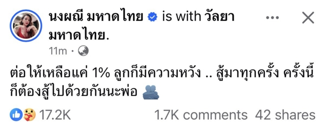 ล่าสุด"จ๊ะ นงผณี" โพสต์เฟซบุ๊กระบุ ต่อให้เหลือแค1%ลูกก็ยังมีความหวัง สู้มาทุกครั้ง ครั้งนี้ก็ต้องสู้ไปด้วยกันนะพ่อ ด้านแฟนคลับแห่ส่งกำลังใจเป็นจำนวนมาก