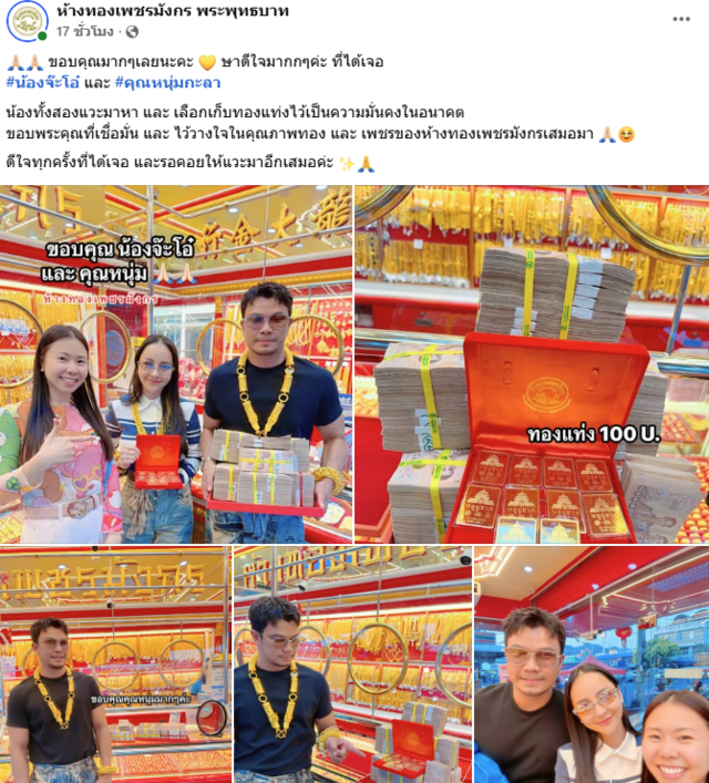ขณะที่เฟซบุ๊ก ห้างทองเพชรมังกร พระพุทธบาท ได้โพสต์ภาพระบุแคปชั่นว่า "ขอบคุณมากๆเลยนะคะ ษาดีใจมากกๆค่ะ ที่ได้เจอ #น้องจ๊ะโอ๋ และ #คุณหนุ่มกะลา น้องทั้งสองแวะมาหา และ เลือกเก็บทองแท่งไว้เป็นความมั่นคงในอนาคต ขอบพระคุณที่เชื่อมั่น และ ไว้วางใจในคุณภาพทอง และ เพชรของห้างทองเพชรมังกรเสมอมา ดีใจทุกครั้งที่ได้เจอ และรอคอยให้แวะมาอีกเสมอค่ะ"