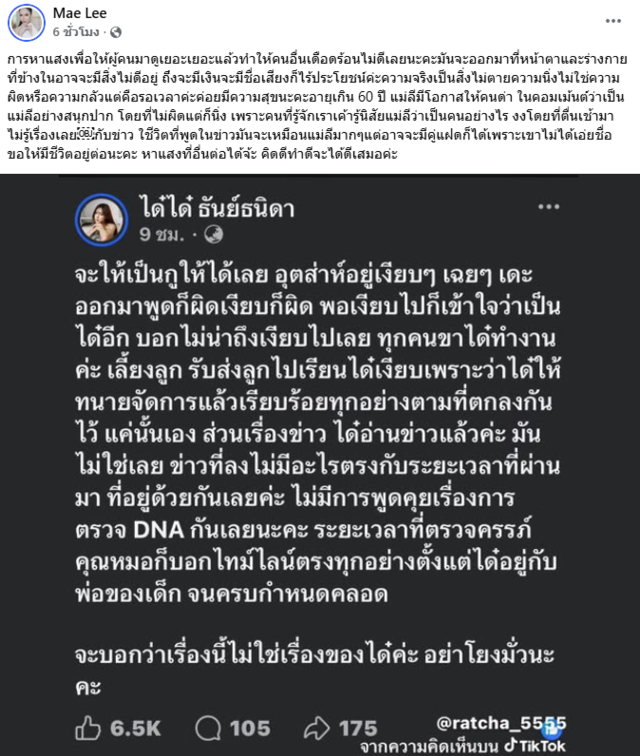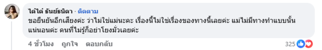 ทั้งนี้ ได๋ได๋ ยังได้คอมเมนต์ตอบว่า "ขอยืนยันอีกเสียงค่ะ ว่าไม่ใช่แม่นะคะ เรื่องนี้ไม่ใช่เรื่องของทางนี้เลยค่ะ แม่ไม่มีทางทำแบบนั้นแน่นอนค่ะ คนที่ไม่รู้ก็อย่าโยงมั่วเลยค่ะ"
