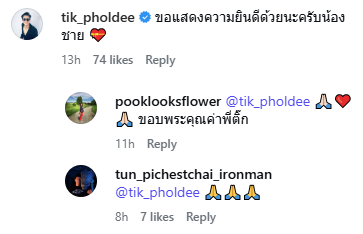 หลังจากโพสต์ภาพไปนั้น คนใกล้ชิด และแฟนคลับต่างเข้ามาแสดงความยินดี รวมถึงพระเอกหล่ออมตะ "ติ๊ก เจษฎาภรณ์ ผลดี" พี่ชายแท้ๆ ก็ได้เข้ามาคอมเมนต์ว่า "ขอแสดงความยินดีด้วยนะครับน้องชาย" ขณะที่ทั้งสองคนก็เข้ามาตอบกลับ