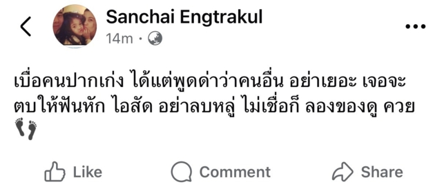โดยเมื่อช่วงกลางดึกที่ผ่านมา เป๊ก สัณณ์ชัย ได้โพสต์ข้อความผ่านเฟซบุ๊กเพจระบุว่า "เบื่อคนปากเก่ง ได้แต่พูดด่าว่าคนอื่น อย่าเยอะ เจอจะตบให้ฟันหัก ไอสั.. อย่าลบหลู่ ไม่เชื่อก็ ลองของดู ค...ย" พร้อมอิโมจิรูปฝ่าเท้า
