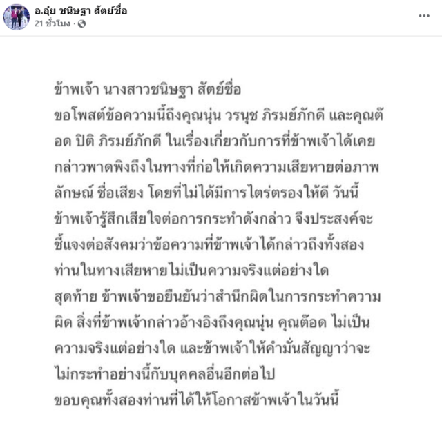 วันนี้ข้าพเจ้ารู้สึกเสียใจต่อการกระทำดังกล่าว จึงประสงค์จะชี้แจงต่อสังคมว่าข้อความที่ข้าพเจ้าได้กล่าวถึงทั้งสองท่านในทางเสียหายไม่เป็นความจริงแต่อย่างใด สุดท้าย ข้าพเจ้าขอยืนยันว่าสำนึกผิดในการกระทำความผิด สิ่งที่ข้าพเจ้ากล่าวอ้างอิงถึงคุณนุ่น คุณต๊อด ไม่เป็นความจริงแต่อย่างใด และข้าพเจ้าให้คำมั่นสัญญาว่าจะไม่กระทำอย่างนี้กับบุคคลอื่นอีกต่อไป ขอบคุณทั้งสองท่านที่ได้ให้โอกาสข้าพเจ้าในวันนี้"