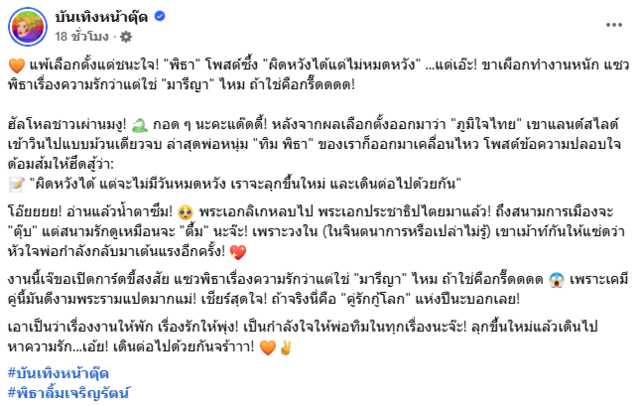 หลังเรื่องนี้ถูกแชร์ออกไปชาวโซเชียล และเพจดังต่างพากันจับตา โดยกล่าวถึงคนที่เคยตกเป็นกระแสจิ้นด้วยอย่าง "มารีญา พูลเลิศลาภ" Miss Universe Thailand 2017 ซึ่งในการประกวดระดับโลกสามารถเข้ารอบ 5 คนสุดท้ายได้ และเคยร่วมงานกับ ทิม พิธา เมื่อครั้งถ่ายแบบขึ้นปก CLEO Most Eligible Bachelors ปี 2008 โดยมี โทนี่ รากแก่น ถ่ายอยู่ด้วย