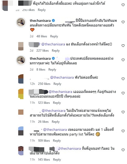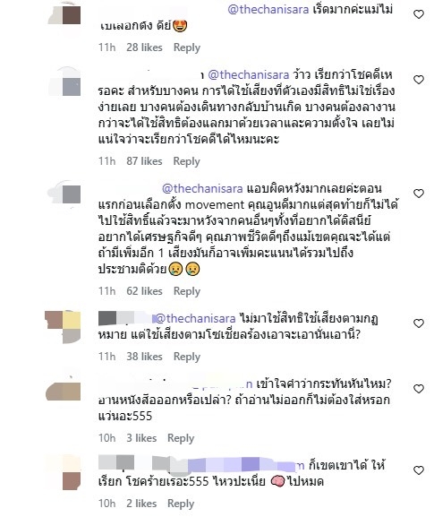 ขณะที่อีกส่วนหนึ่ง ก็ได้เข้ามาเมนต์ว่า "ไม่เป็นไรค่ะสามารถแจ้งเหตุไม่สามารถไปใช้สิทธิ์เลือกตั้งได้นะคะภายใน 7 วันหลังเลือกตั้ง" ซึ่งเจ้าตัวก็ตอบกลับว่า "เรียบร้อยค่ะ"