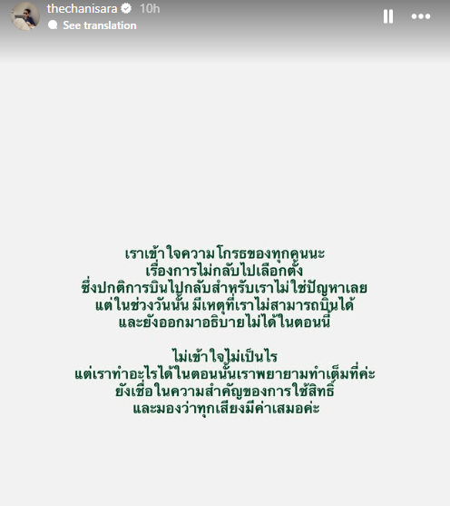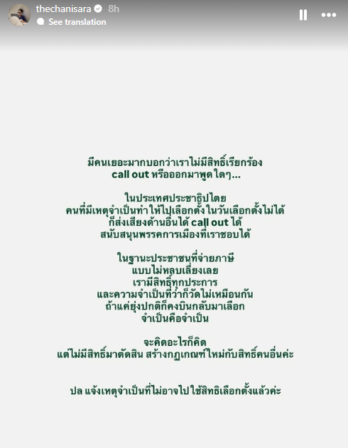 พร้อมกับโพสต์ต่อว่า "มีคนเยอะมากบอกว่า เราไม่มีสิทธิ์เรียกร้อง call out หรือออกมาพูดใดๆ…ในประเทศประชาธิปไตย คนที่มีเหตุจำเป็นทำให้ไปเลือกตั้งในวันเลือกตั้งไม่ได้ ก็ส่งเสียงด้านอื่นได้ call out ได้ สนับสนุนพรรคการเมืองที่เราชอบได้ ในฐานะประชาชนที่จ่ายภาษี แบบไม่หลบเลี่ยงเลย เรามีสิทธิ์ทุกประการ และความจำเป็นที่ว่าก็ไม่เหมือนกัน ถ้าแค่อยู่ปกติก็คงบินกลับมาเลือก จำเป็นคือจำเป็น จะคิดอะไรก็คิด แต่ไม่มีสิทธิ์มาตัดสิน สร้างกฎเกณฑ์ใหม่กับสิทธิ์คนอื่นค่ะ ปล แจ้งเหตุจำเป็นที่ไม่อาจไปใช้สิทธิเลือกตั้งแล้วค่ะ"