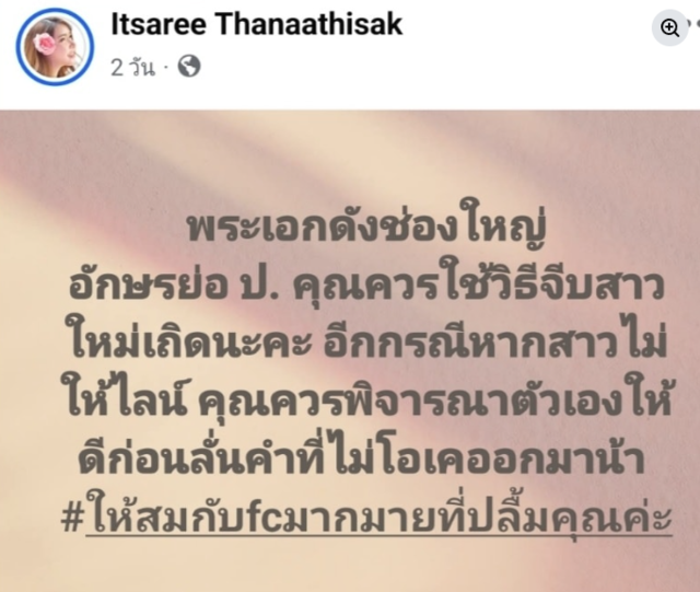 มีเรื่องราวมาให้ขาเผือกได้ใส่ใจกันอีกแล้ว เมื่อ "นุ่มนิ่ม อิสรีย์" นางแบบสาวออกมาเคลื่อนไหวในเฟซบุ๊กเพจด้วยข้อความว่า "พระเอกดังช่องใหญ่ อักษรย่อ ป. คุณควรใช้วิธีจีบสาวใหม่เถิดนะคะ อีกกรณีหากสาวไม่ให้ไลน์ คุณควรพิจารณาตัวเองให้ดีก่อน ลั่นคำที่ไม่โอออกมาน้า #ให้สมกับFCมากมายที่ปลื้มคุณค่ะ"