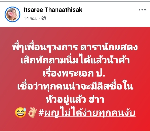 ทั้งยังโพสต์ดักคอทุกคนไว้ว่า "พี่ๆเพื่อนๆวงการ ดารานักแสดง เลิกทักมาถามส่วนตัวได้แล้ว เรื่องพระเอก ป. เชื่อว่าทุกคนน่าจะมีลิสต์รายชื่อในหัวอยู่แล้ว #ผญไม่ได้ง่ายทุกคนงับ"