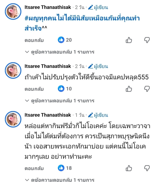 ก่อนจะเผยต่ออีกว่า "หล่อแต่หากินฟรีมั่วก็ไม่โอเค โดยเฉพาะวาจา เมื่อไม่ได้ดั่งใจตามที่ต้องการ ควรมีความเป็นสุภาพบุรุษนิดนึง เจอพระเอกทักมาบ่อย แต่คนนี้ไม่โอเคมากๆ เลย อย่าหาทำนะคะ" และ "ถ้าเขาไม่ปรับปรุงตัวให้ดีขึ้น อาจมีคลิปหลุด"