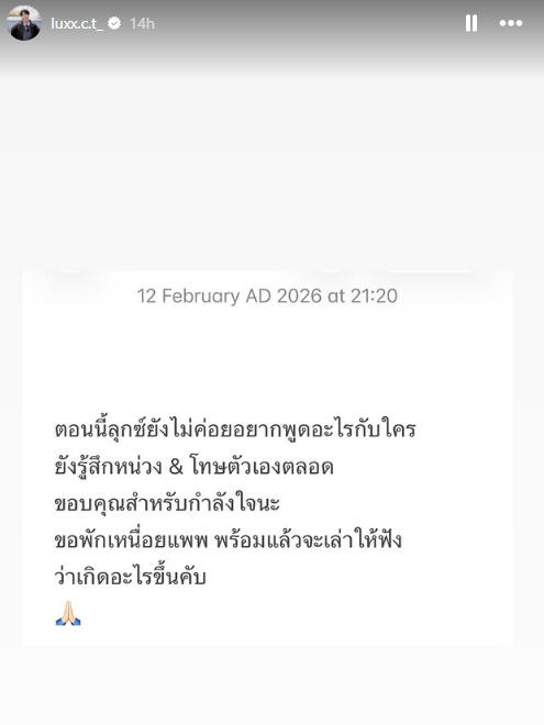 ขณะที่ "ลุกซ์" ได้ออกมาโพสต์ไอจีสตอรี่ว่า "ตอนนี้ลุกซ์ยังไม่ค่อยอยากพูดอะไรกับใคร ยังรู้สึกหน่วง โทษตัวเองตลอด ขอบคุณสำหรับกำลังใจนะ ขอพักเหนื่อยแพพ พร้อมแล้วจะเล่าให้ฟัง ว่าเกิดอะไรขึ้นคับ"