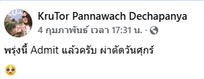 ย้อนไปเมื่อวันที่ 4 ก.พ. 2569 เจ้าตัวได้โพสต์ข้อความผ่านเฟซบุ๊กว่า "พรุ่งนี้ Admit แล้วครับ ผ่าตัดวันศุกร์" ซึ่งวันศุกร์นั้นตรงกับเมื่อวันที่ 6 ก.พ. และเมื่อไม่กี่ชั่วโมงก่อนหน้านี้ เจ้าตัวเพิ่งจะเปลี่ยนภาพโปรไฟล์ในเฟซบุ๊ก ซึ่งถือว่าเป็นโพสต์สุดท้ายก่อนจากไป ทั้งนี้ต้องขอแสดงความเสียใจกับทางครอบครัวผู้สูญเสียด้วยค่ะ