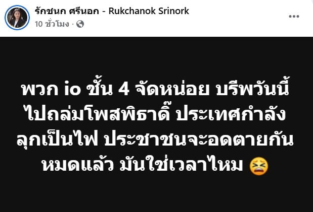 ขณะที่ ไอซ์ รักชนก ศรีนอก ว่าที่ สส.บัญชีรายชื่อ พรรคประชาชน ก็ได้โพสต์เฟซบุ๊กเช่นกัน ระบุว่า "พวก io ชั้น 4 จัดหน่อย บรีพวันนี้ ไปถล่มโพสต์พิธาดิ๊ ประเทศกำลังลุกเป็นไฟ ประชาชนจะอดตายกันหมดแล้ว มันใช่เวลาไหม" แถมยังแซวในอินสตาแกรมพิธาว่า ประชาชนเค้ากำลังเครียดการเมืองกันอยู่ไหม