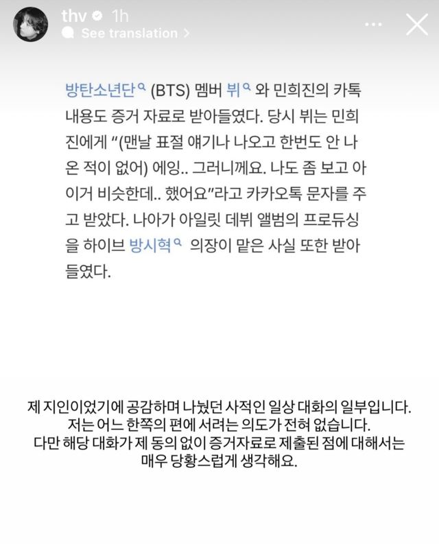 วันนี้ (20 ก.พ. 2569) ทางด้านของ V ได้โพสต์ไอจีสตอรี่ ด้วยภาพสกรีนช็อตของบทความข่าวที่มีการรายงานว่า "ศาลยังรับข้อความแชต KakaoTalk ระหว่าง BTS สมาชิก V กับ มินฮีจิน เป็นหลักฐานด้วย ในเวลานั้น วีได้ส่งข้อความถึงมินฮีจินว่า "(มีแต่เรื่องลอกเลียนแบบออกมาตลอด ไม่เคยไม่มีเลย) ก็ใช่ครับ ผมเองก็ดูแล้วคิดว่า อันนี้มันคล้ายอยู่นะ" นอกจากนี้ ยังยอมรับด้วยว่าอัลบั้มเดบิวต์ของวง ILLIT ได้รับการโปรดิวซ์โดย Bang Si-hyuk ประธานของ HYBE อีกด้วย
