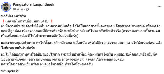 ขณะที่ "เดอะมีน" ก็ได้เผยเพิ่มเติมในเฟซบุ๊กว่า "ขออัปเดตนะครับ เหตุผลในการเลื่อนนัดนะครับ ผมมีความประสงค์จะใช้เงินคืนตามความเป็นจริง จึงได้ยื่นเอกสารชี้แจงรายละเอียดจากสเตทเมนต์ เพื่อแสดงยอดที่ถูกต้อง เนื่องจากยอดที่มีการฟ้องร้องมายังมีบางส่วนที่ไม่ตรงกับข้อเท็จจริง (ส่วนของทนายทั้งสามคน เป็นเพื่อนและน้องที่ได้เข้ามาช่วยเหลือในส่วนนี้ครับ) และจากเหตุผลด้านบน ทำให้ทั้งสองฝ่ายจึงตกลงเลื่อนนัด เพื่อให้มีเวลาตรวจสอบเอกสารให้ชัดเจนก่อน แล้วจึงนัดหมายกันใหม่ครับ