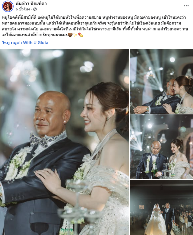ล่าสุด ต้นข้าว ยังได้โพสต์ข้อความสุดซึ้งระบุว่า "หนูโชคดีที่มีสามีที่ดี แต่หนูไม่ได้ขายหัวใจเพื่อความสบาย หนูทำงานของหนู มีคุณค่าของหนู เข้าใจนะคะว่าหลายคนอาจมองแบบนั้น แต่ถ้าได้เห็นตอนที่เราดูแลกันจริงๆ จะรู้เลยว่ามันไม่ใช่เรื่องเงินเลย มันคือความสบายใจ ความห่วงใย และความตั้งใจที่เรามีให้กันไม่ใช่เพราะเขามีเงิน ทั้งนี้ทั้งนั้น หนูฝากกลูต้าวิธยูนะคะ หนูจะได้ตอบแทนสามีบ้าง รักทุกคนนะคะ"