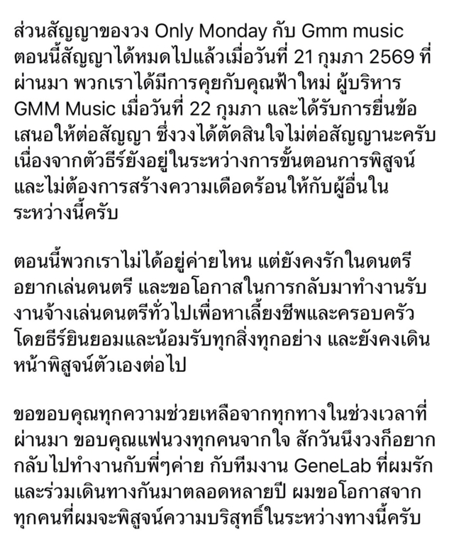 ส่วนสัญญาของวง Only Monday กับ Gmm music ตอนนี้สัญญาได้หมดไปแล้วเมื่อวันที่ 21 กุมภา 2569 ที่ผ่านมา พวกเราได้มีการคุยกับคุณฟ้าใหม่ ผู้บริหาร GMM Music เมื่อวันที่ 22 กุมภา และได้รับการยื่นข้อเสนอให้ต่อสัญญา ซึ่งวงได้ตัดสินใจไม่ต่อสัญญานะครับ เนื่องจากตัวธีร์ยังอยู่ในระหว่างการขั้นตอนการพิสูจน์ และไม่ต้องการสร้างความเดือดร้อนให้กับผู้อื่นในระหว่างนี้ครับ