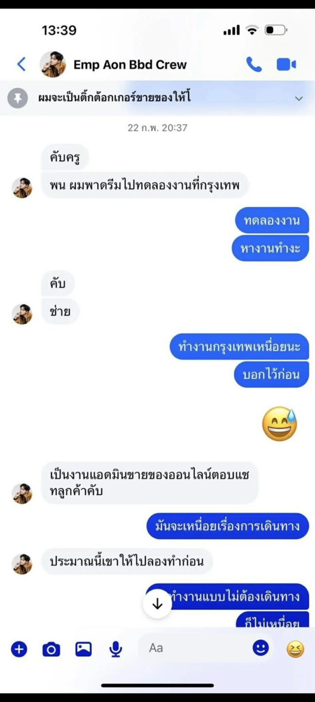 พร้อมกันนี้ยังได้เปิดแชทสุดท้ายที่ได้พูดคุยกัน ซึ่งระบุว่า "พรุ่งนี้ ผมพาดรีมไปทดลองงานที่กรุงเทพ เป็นงานแอดมินขายของออนไลน์ ตอบแชทลูกค้า ประมาณนี้ เขาให้ไปลองทำก่อน"