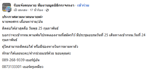 ประกาศตามหาคนหายค่ะ นายพงศกร เผื่อนผาราม หรือ อ้น ติดต่อได้ล่าสุดคือ วันพุธ 25 กุมภาพันธ์ บอกว่าจะเข้ากทม.พาแฟนไปทดลองงานที่สมัครไว้ มีประชุมอบรมวันที่ 25 เดินทางเข้ากทม.วันที่ 24 กุมภาพันธ์ ผู้ใดสามารถติดต่อได้ หรือมีช่องทางในการตามหาตัว ทักมาได้เลยนะคะ/ฝากช่วยแชร์ด้วย ขอบคุณค่ะ 089-268-9339 เบอร์ปู่อ้น, 0873133301 เบอร์ครูเหมียว