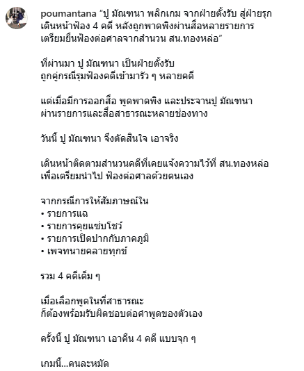 วันนี้ ปู มัณฑนา จึงตัดสินใจ เอาจริง เดินหน้าติดตามสำนวนคดีที่เคยแจ้งความไว้ที่ สน.ทองหล่อ เพื่อเตรียมนำไป ฟ้องต่อศาลด้วยตนเองจากกรณีการให้สัมภาษณ์ใน รายการแฉ รายการคุยแซ่บโชว์ รายการเปิดปากกับภาคภูมิ เพจทนายคลายทุกข์ รวม 4 คดีเต็มๆ เมื่อเลือกพูดในที่สาธารณะ ก็ต้องพร้อมรับผิดชอบต่อคำพูดของตัวเอง ครั้งนี้ ปู มัณฑนา เอาคืน 4 คดี แบบจุกๆ เกมนี้…คนละหมัด"