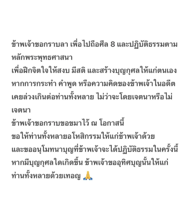"แจ็ค แฟนฉัน" เผยว่า "ข้าพเจ้าขอกราบลา เพื่อไปถือศีล 8 และปฏิบัติธรรมตามหลักพระพุทธศาสนา เพื่อฝึกจิตใจให้สงบ มีสติ และสร้างบุญกุศลให้แก่ตนเอง หากการกระทำ คำพูด หรือความคิดของข้าพเจ้าในอดีตเคยล่วงเกินต่อท่านทั้งหลาย ไม่ว่าจะโดยเจตนาหรือไม่เจตนา