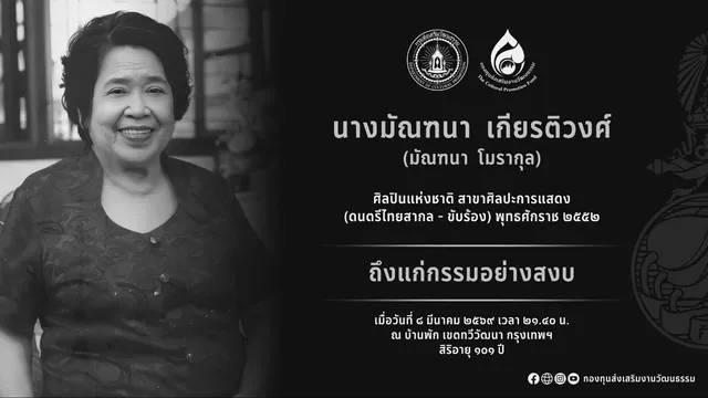 กรมส่งเสริมวัฒนธรรม โดยกองกองทุนส่งเสริมงานวัฒนธรรม ได้รับประสานจากครอบครัวของนางมัณฑนา เกียรติวงศ์ ศิลปินแห่งชาติ สาขาศิลปะการแสดง (ดนตรีไทยสากล - ขับร้อง) พุทธศักราช ๒๕๕๒ ว่า นางมัณฑนา เกียรติวงศ์ ถึงแก่กรรมอย่างสงบด้วยโรคชรา เมื่อวันอาทิตย์ที่ ๘ มีนาคม พ.ศ. ๒๕๖๙ เวลา ๒๑.๔๐ น. ณ บ้านพัก เขตทวีวัฒนา กรุงเทพฯ สิริอายุ ๑๐๑ ปี
