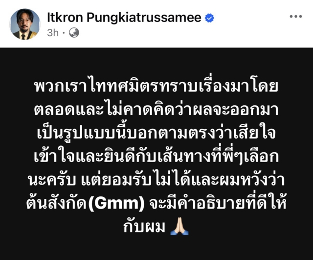 ขณะที่ "กิต three man down" ออกมาโพสต์เช่นกันว่า "ทราบเรื่องมานาน และเข้าใจพี่โอมครับ แต่ที่ไม่เข้าใจคืออีกฝั่งมากกว่าครับ" ก่อนจะเผยต่อว่า "ที่ Three Man Down มาอยู่ Genelab เพราะว่า พี่โอม ครับ พี่โอมเป็น Leader ไม่ใช่ Boss พี่โอม เดินไปกับน้องๆ และอีกอย่างคือ คุยกับพี่โอมตั้งแต่ Day One ว่า อยากจะเปลี่ยนแปลงทุกอย่าง ในสถานที่แห่งนี้ ให้ดีขึ้น ถึงแม้จะยากลำบากขนาดไหน เราจะทำให้ทุกอย่างดีขึ้น พวกเราตั้งใจ ไม่เอาเปรียบใคร ตั้งใจทำงาน ทำตัวให้เป็น โมเดล ใหม่ๆ จัดการงานเอง ทำให้ดูว่าศิลปิน มีค่าในตัวเองมากขนาดไหน แต่วันนี้เข้าใจและยอมรับเหมือนพี่โอมแล้วครับว่าเราไม่มีวันทำได้ เราผิดเองครับที่เสือกจะไปเปลี่ยนแปลงบ้านของคนอื่น เราควรหาบ้านตัวเองอยู่มากกว่า"