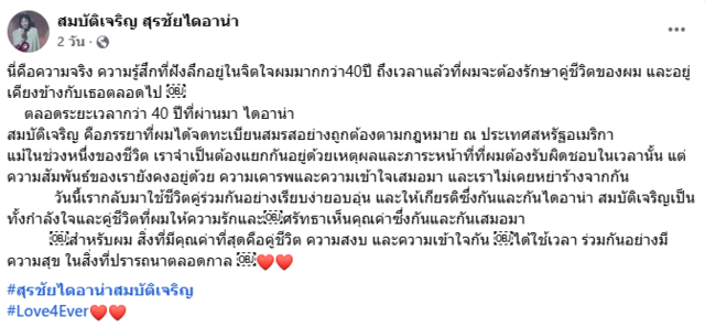 โดยระบุแคปชั่นว่า "นี่คือความจริง ความรู้สึกที่ฝังลึกอยู่ในจิตใจผมมากกว่า 40 ปี ถึงเวลาแล้วที่ผมจะต้องรักษาคู่ชีวิตของผม และอยู่เคียงข้างกับเธอตลอดไป ตลอดระยะเวลากว่า 40 ปีที่ผ่านมา ไดอาน่า สมบัติเจริญ คือภรรยาที่ผมได้จดทะเบียนสมรสอย่างถูกต้องตามกฎหมาย ณ ประเทศสหรัฐอเมริกา แม้ในช่วงหนึ่งของชีวิต เราจำเป็นต้องแยกกันอยู่ด้วยเหตุผลและภาระหน้าที่ที่ผมต้องรับผิดชอบในเวลานั้น แต่ความสัมพันธ์ของเรายังคงอยู่ด้วย ความเคารพและความเข้าใจเสมอมา และเราไม่เคยหย่าร้างจากกัน