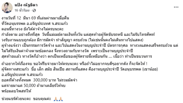 โดยเผยข้อความว่า "งานวันที่ 12 มีนา 69 ที่เล่นผ่านมาเมื่อคืน ที่วัดอนุบรรพต อ.อรัญประเทศ จ.สระแก้ว ตอนนี้ทางวง ยังได้ค่าจ้างไม่ครบนะคะ กำลังตาม อย่างถึงที่สุด วันนี้แม่เมย์ตามเงินทั้งวัน แต่สุดท้ายผู้จัดขับรถหนี และไม่รับโทรศัพท์ วงรับงานแบบถูกต้อง มีการมัดจำ ทำสัญญา ครบถ้วน (ไม่เช่นนั้นคงไม่เดินทางไปแสดง)