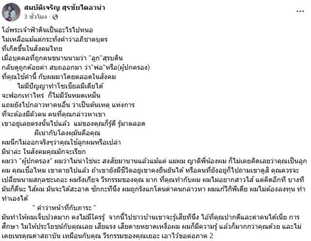 ล่าสุด เฟซบุ๊ก "สมบัติเจริญ สุรชัยไดอาน่า" ได้โพสต์ข้อความร่ายยาวพูดถึงลูกที่ดูถูกด้อยค่าผู้เป็นพ่อ เผยข้อความว่า "โอ้พระเจ้าฟ้าดินเป็นอะไรไปหนอ ไม่เหลือแม้แต่กระทั่งคำว่าอภิชาตบุตร ที่เกิดขึ้นในสังคมไทย เมื่อบุคคลที่ถูกคนขนานนามว่า "ลูก" สุรบดิน กลับดูถูกด้อยค่า สบถออกมา ว่า"พ่อ"หรือ(ผู้ปกครอง) ที่คุณใช้คำนี้ กับผมมาโดยตลอดในสังคม